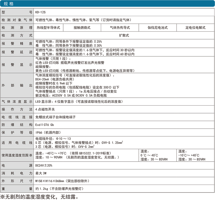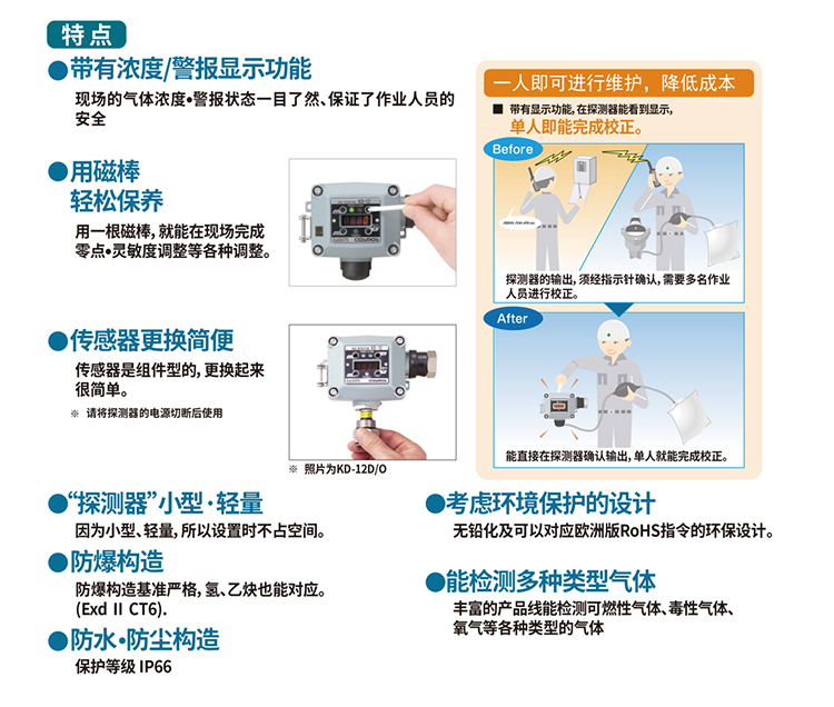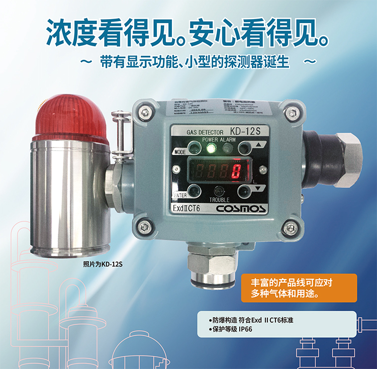 KD-12系列是一款數(shù)值顯示、聲光報(bào)警多種氣體檢測(cè)儀。殼體可搭載隔爆式聲光報(bào)警燈;帶濃度顯示功能,在現(xiàn)場(chǎng)可讀取濃度;使用磁棒操作,維護(hù)簡(jiǎn)單;單元式傳感器,方便替換;隔爆型外殼設(shè)計(jì) ExdII CT6;防水防塵構(gòu)造 保護(hù)等級(jí)IP66;輕量化設(shè)計(jì)采用免螺絲式端子臺(tái),接線簡(jiǎn)單基板電子部件和焊接實(shí)現(xiàn)無(wú)鉛化。用于燃?xì)狻⑹突ぁ⑵嚒⒋暗刃袠I(yè)。
