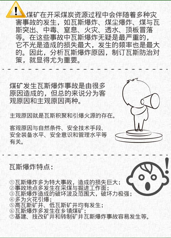 礦難,指在采礦過程中發(fā)生的事故,通常造成傷亡的危險性*大。引發(fā)礦難的原因可能有多種,包括有毒氣體泄漏(硫化氫)或者天然氣爆炸(比如甲烷),煤炭粉塵爆炸,地震活動、水災(zāi)或者機械故障及指揮失誤等。但礦井事故站多數(shù)為氣體爆炸所引發(fā),采礦層面瓦斯?jié)舛冗^高,達(dá)到爆炸的*限,若有引爆條件時(如鐵鍬碰撞石炭產(chǎn)生火花,電器開關(guān)電弧等)即可產(chǎn)生瓦斯爆炸,采煤層若通風(fēng)不暢,安全監(jiān)測不到位也可引起瓦斯積累,也是非常危險的。