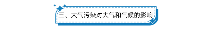 大氣污染物質還會影響天氣和氣候。顆粒物使大氣能見度降低,減少到達地面的太陽光輻射量。尤其是在大工業城市中,在煙霧不散的情況下,日光比正常情況減少40% 。高層大氣中的氮氧化物、碳氫化合物和氟氯烴類等污染物使臭氧大量分解,引發的“臭氧洞”問題,成為了全球關注的焦點。