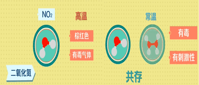二氧化氮又稱為過氧化氮,是大π鍵結構的典型分子。大π鍵含有三個電子,其中兩個進入成鍵π軌道,一個進入反鍵π軌道。二氧化氮室溫下為紅棕色氣體,易溶于水且具有刺激性氣味。吸入二氧化氮可能對肺組織產生強烈的刺激作用和腐蝕作用。由于其結構的不穩定性,通常情況下與其二聚體形式——四氧化二氮(無色氣體)混合存在,構成一種平衡態混合物。二氧化氮轉化而四氧化二氮放熱。升高溫 圖中左為熱水,右為冰水度,平衡向二氧化氮合成的方向移動;降分子結構: 二氧化氮 分子是V形分子、極性分子。